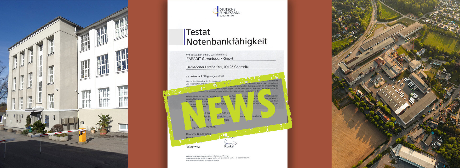 Auch 2026 erhält die FARADIT Gewerbepark GmbH die Einstufung der Notenbankfähigkeit aus der Bonitätsanalyse der Deutschen Bundesbank und damit die wiederholte Bescheinigung als besonders kreditwürdiges Unternehmen. Wir freuen uns erneut, unseren Geschäftspartnern mit dieser Bonitätseinstufung und Auszeichnung eine vertrauensvolle, solide und nachhaltige Zusammenarbeit zusichern zu können.